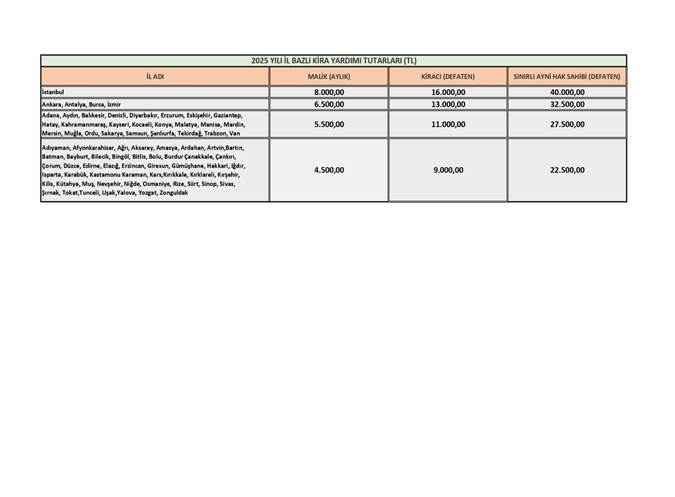 Çevre, Şehircilik ve İklim Değişikliği Bakanlığı tarafından yayımlanan 2025 yılına ait kentsel dönüşüm kira yardımı tablosuna göre, il bazında malikler, kiracılar ve sınırlı aynî hak sahiplerine yapılacak kira yardımı tutarları belirlenmiştir :